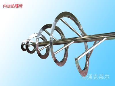 内加热螺带锥形真空干燥机是一种利用螺带将物料旋转提升及圆锥夹套、空心螺带内同时通入传热介质(如热水、导热油、蒸汽等),使加热后物料从四周提升并从中间下落,快速不断的循环翻转,并通过筒体内抽真空将水汽及时带走, 使物料在短时间内达到干燥和混合目的。与传统的立式混合机相比,筒体内没有任何传动机构,从根本上杜绝因润滑油泄漏而导致物料污染,运行可靠稳定,特别适宜卫生要求高的粉料、颗粒混合;同时也适用于粘性流体或稠状、湿状为主物料的搅拌混合;与其它卧式干燥机相比,具有出料方便,可以100%完全出料,操作、维修方便。