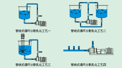 管线式高剪切分散乳化机(乳化泵)适用于批量循环分散乳化工艺和在线连续分散乳化工艺,典型工艺流程如图。