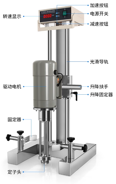 - 不锈钢机头外壳,手动升降,另配有三种定子头供实验室使用