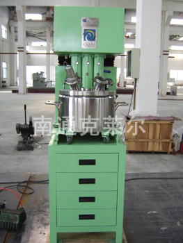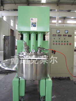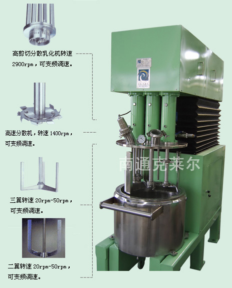 该机由高剪切分散乳化机、高速分散器和特殊的锚式搅拌机组成的联合结构,因此,它的流体模型有了很大的变化。当高剪切分散乳化机从罐的底部连续向上抽吸并向水平喷射时,却遇到了锚式搅拌器沿周向旋转流在不同层高断面的垂直切割,使向水平的流模速度大大减弱并扭曲。高速分散器使物流中的粒子进一步分散、粉碎。因此,多功能混合机强化了乳化、分散、均质、混合和粉碎的作用,其性能更为优越,国外称该机为“性能优良的万能机”。该机犹如一个完整的加工厂,三种功能的设备也可分别单独使用及不同组合,为精细化工、化妆品及医药工业的粘性物料提供了快速而有效的混合、均质及乳化。