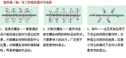 电机可采用普通电机、防爆电机、双速电机、变频电机,连接方式有电机、减速机与螺条搅拌机构采用直联,还有采用链条或皮带传动,或摆线针轮连接式。